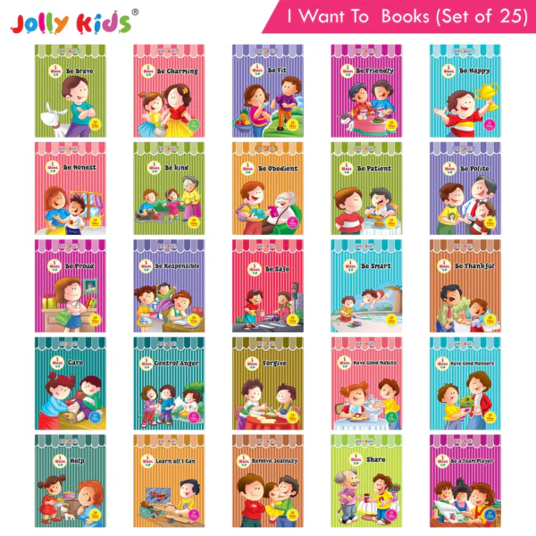 Jolly Kids – I Want To Character-Based Short Stories (Set of 25) is a thoughtfully designed early learning storybook set that helps young children build strong moral values, positive habits, and emotional intelligence from an early age. Created for children aged 3-6 years, this complete collection introduces essential character traits such as kindness, sharing, helping others, patience, honesty, gratitude, responsibility, teamwork, self-control, safety awareness, and good manners.